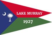 Thoughtfully designed and trademarked around 2022, to represent beautiful Lake Murray, this flag geographically represents the lake. The Red and green are the navigation colors (port and starboard). RED navigation lights on the Chapin side and GREEN lights on the Lexington side. The white seam represents the historic dam/North Lake Dr with the SC State Flag symbol closer to the Capital City. The other end of the flag and of the lake are the double swallowtails representing the two streams of the Saluda River which feeds the lake.